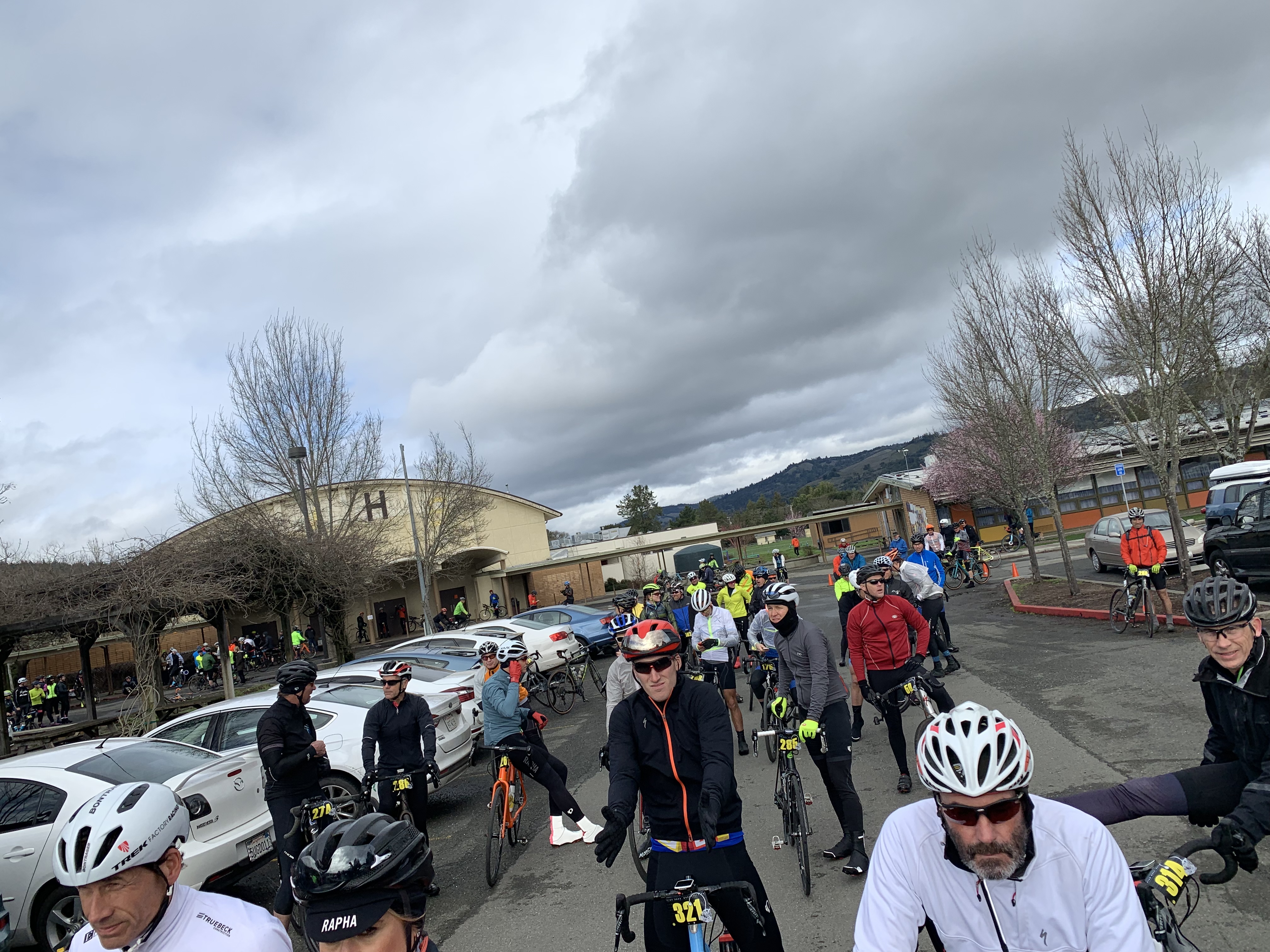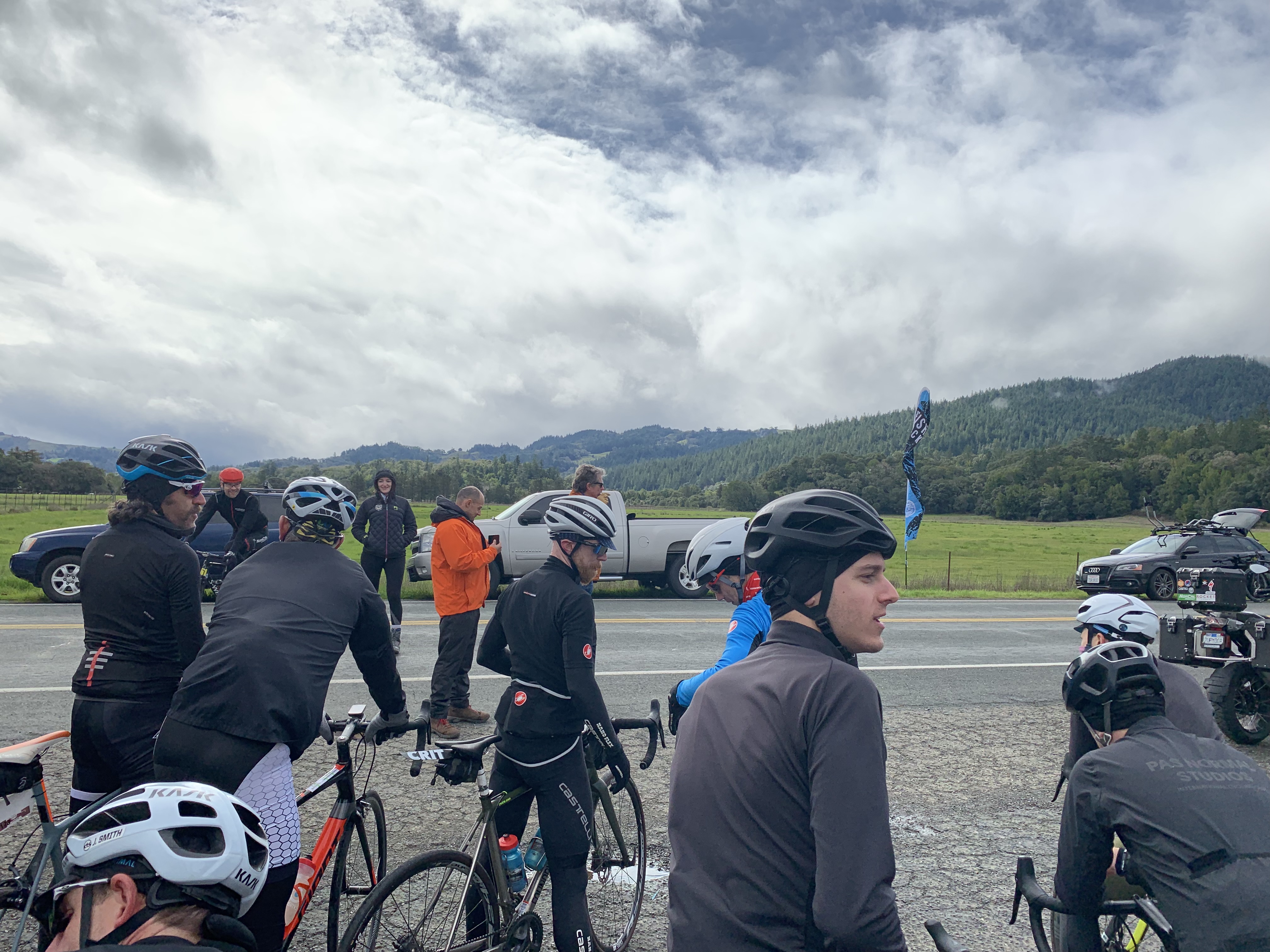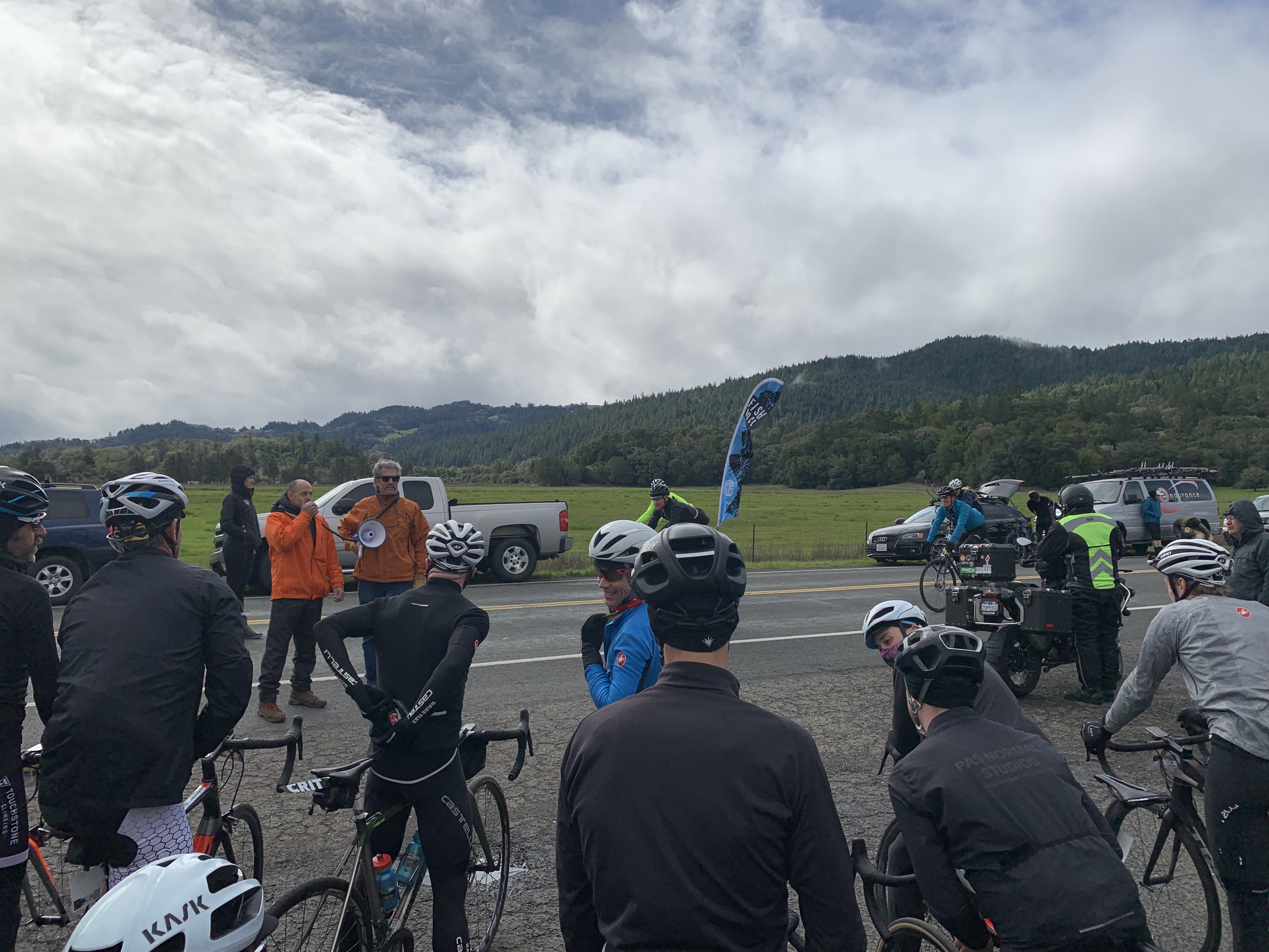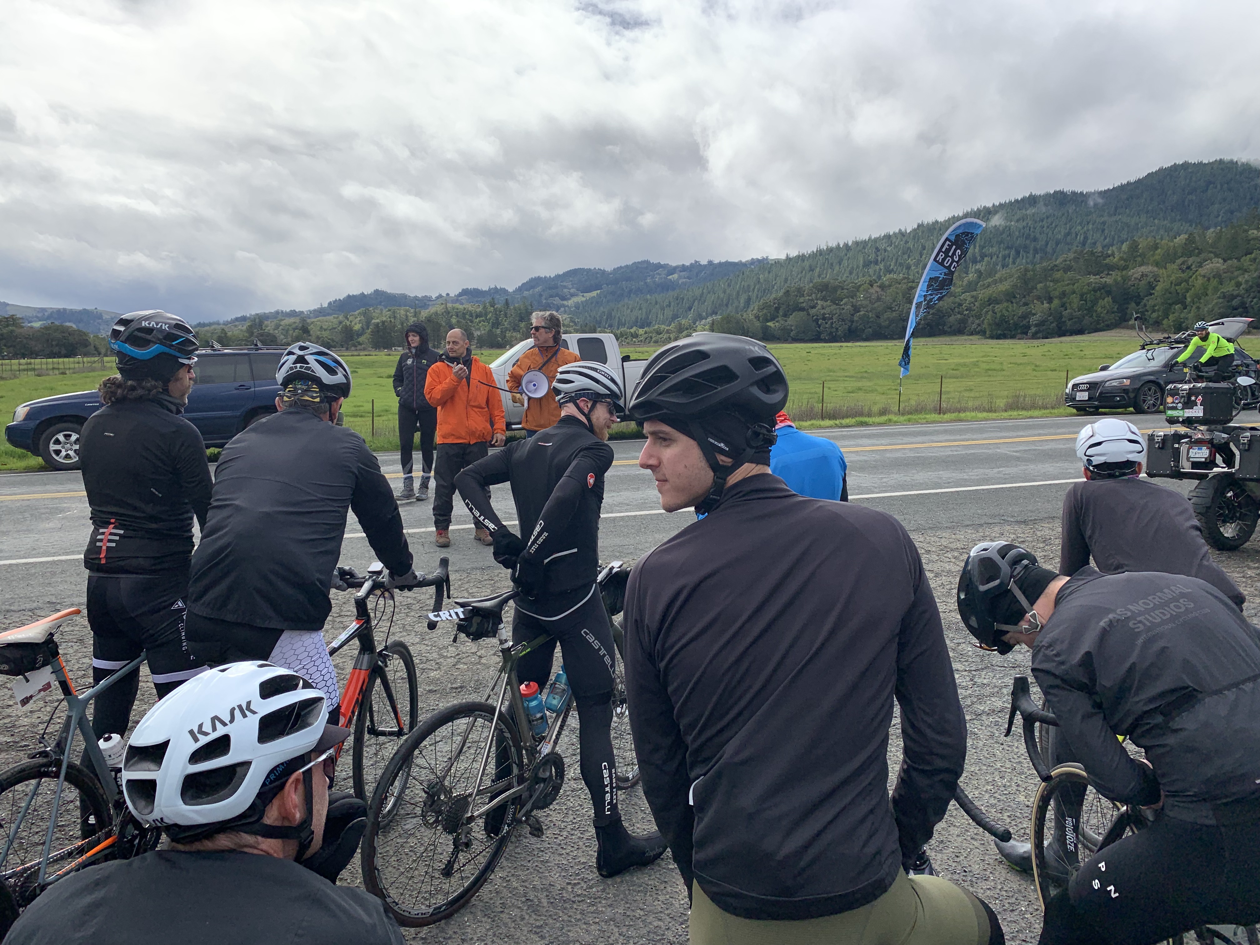 Got dressed and ready while constantly snacking on bananas, almond butter and bacon and keeping caffeinated. The weather started to improve, and the sun even came out, but the radar showed it was just a little break in between fronts. Around 9am Carlos announced that start was postponed by 45 min to allow the snow slush at the top of Mountain View Road to melt and clear.