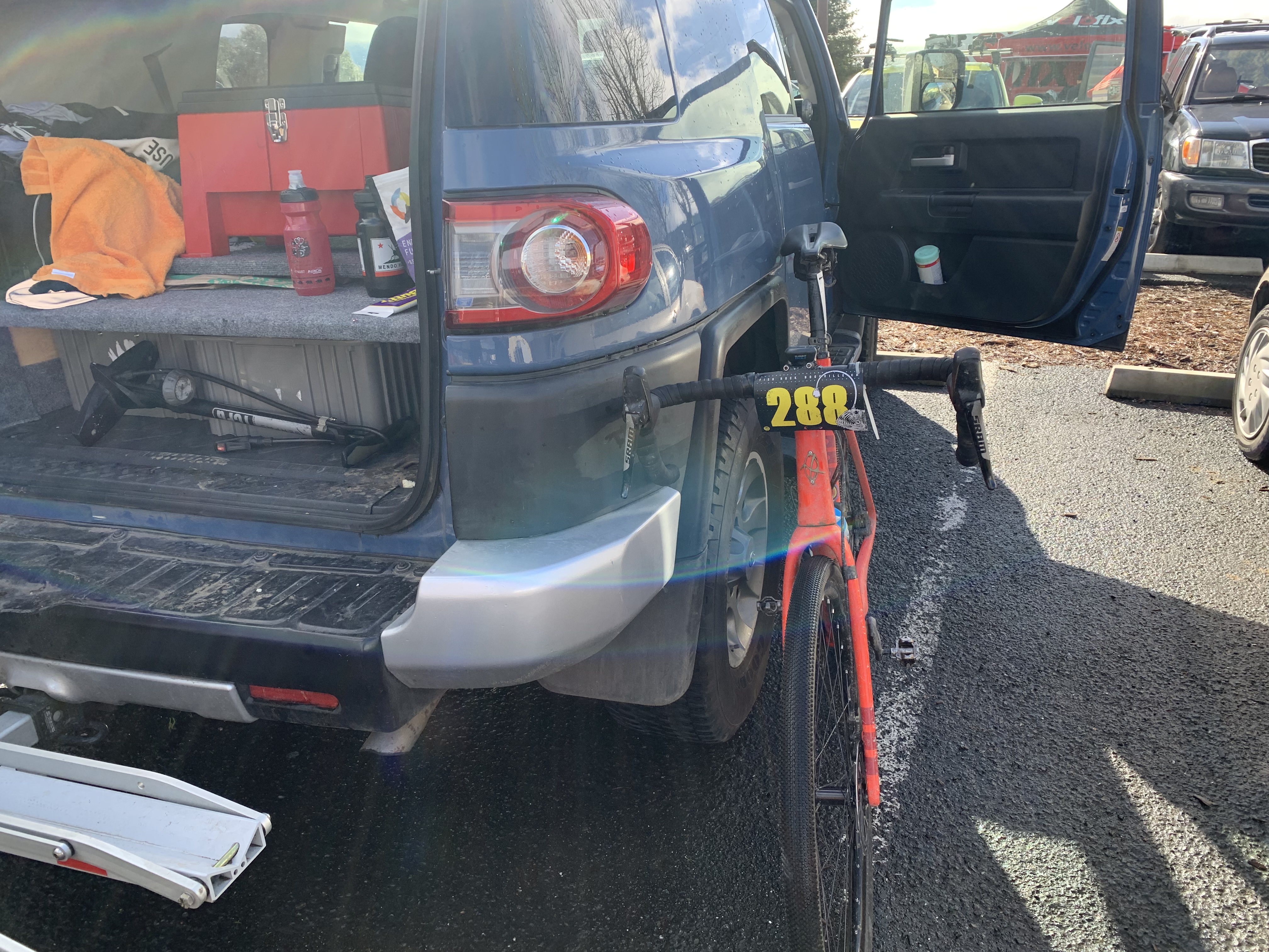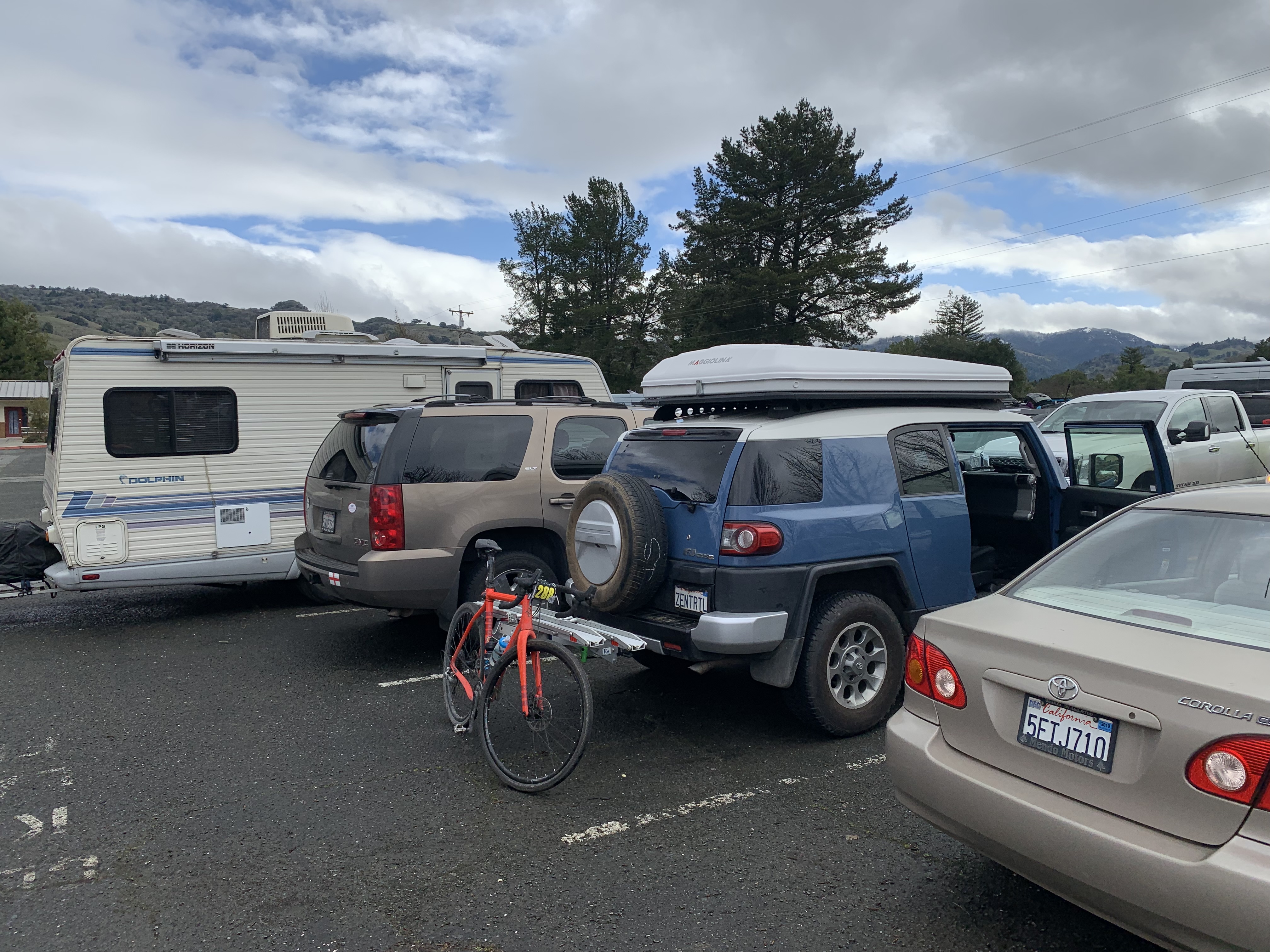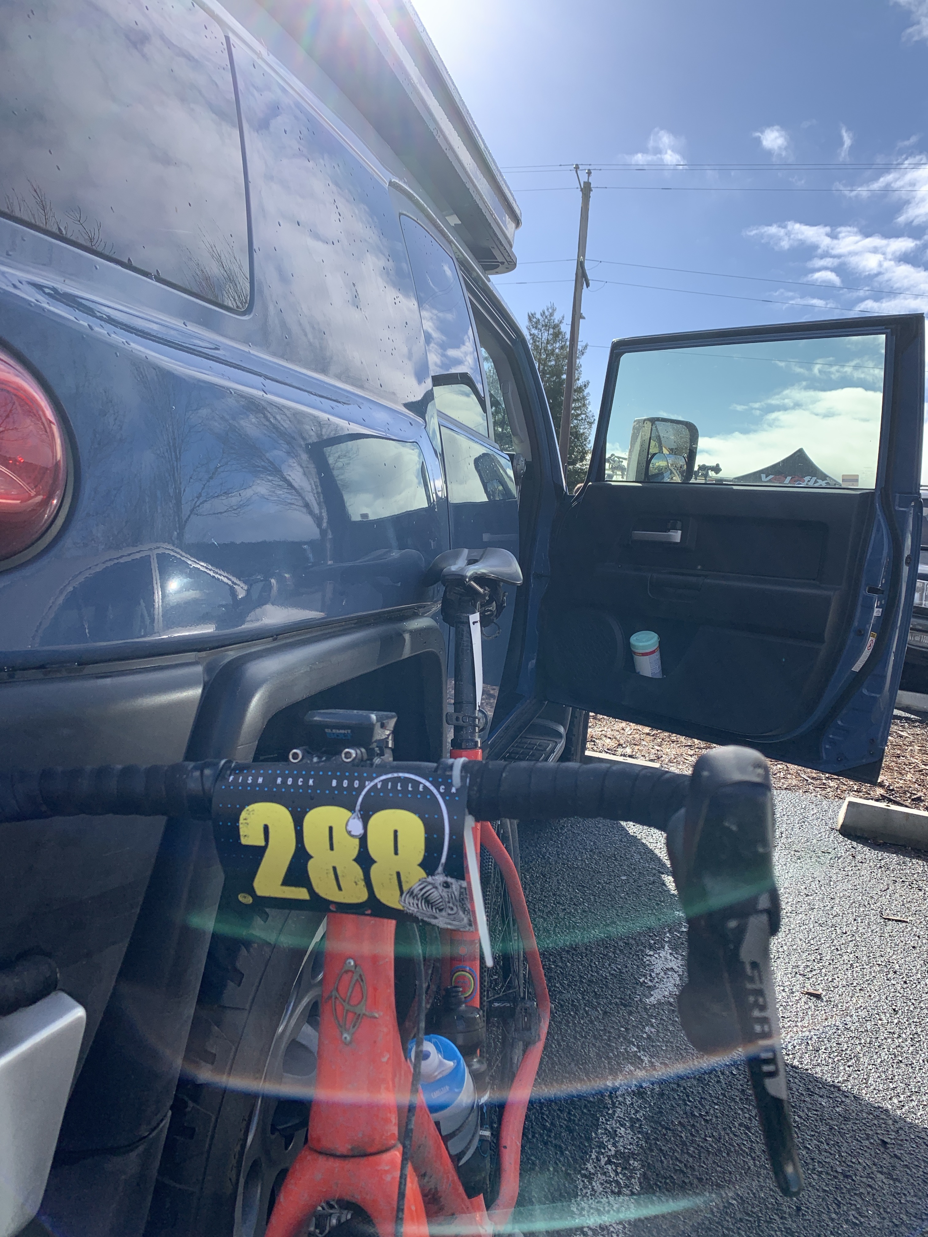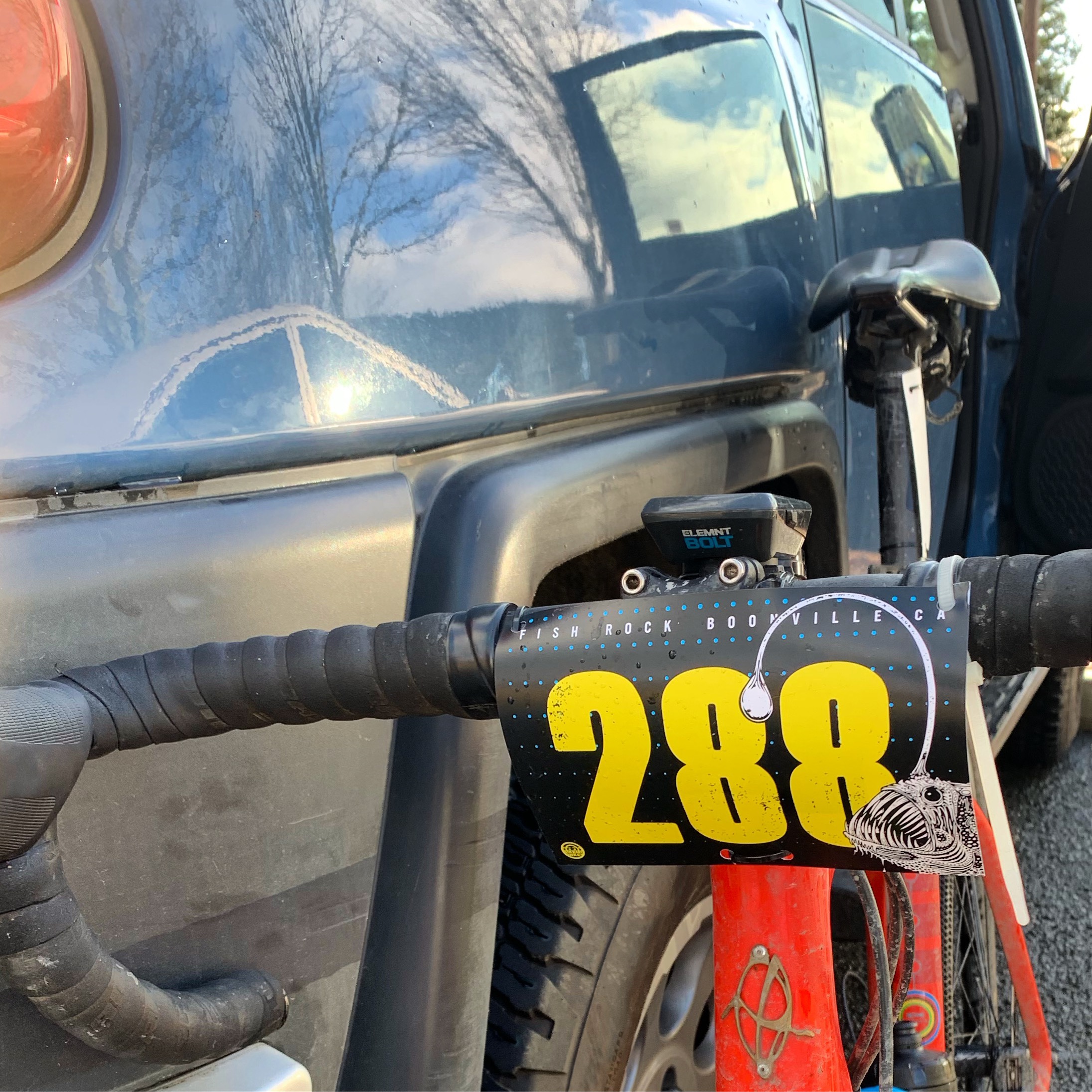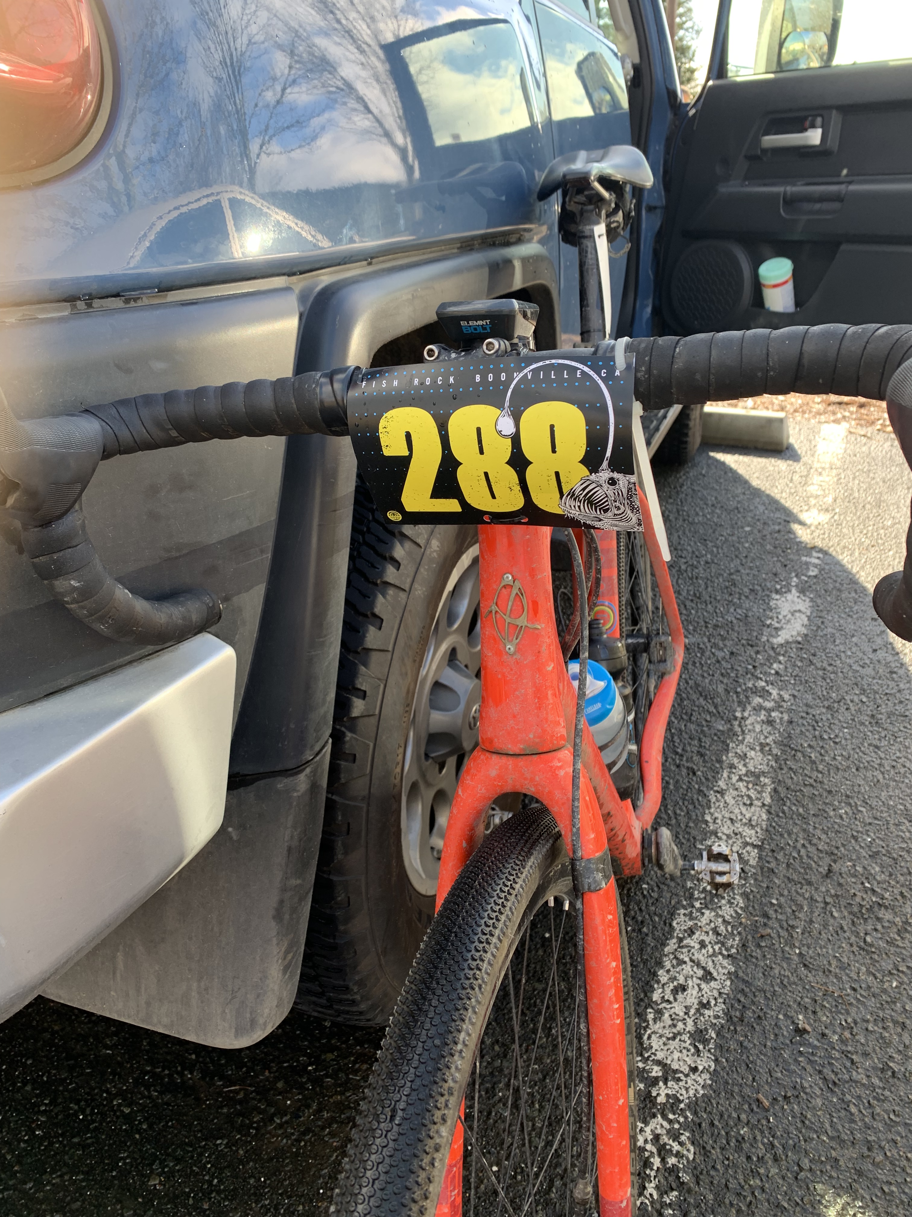Got dressed and ready while constantly snacking on bananas, almond butter and bacon and keeping caffeinated. The weather started to improve, and the sun even came out, but the radar showed it was just a little break in between fronts. Around 9am Carlos announced that start was postponed by 45 min to allow the snow slush at the top of Mountain View Road to melt and clear.