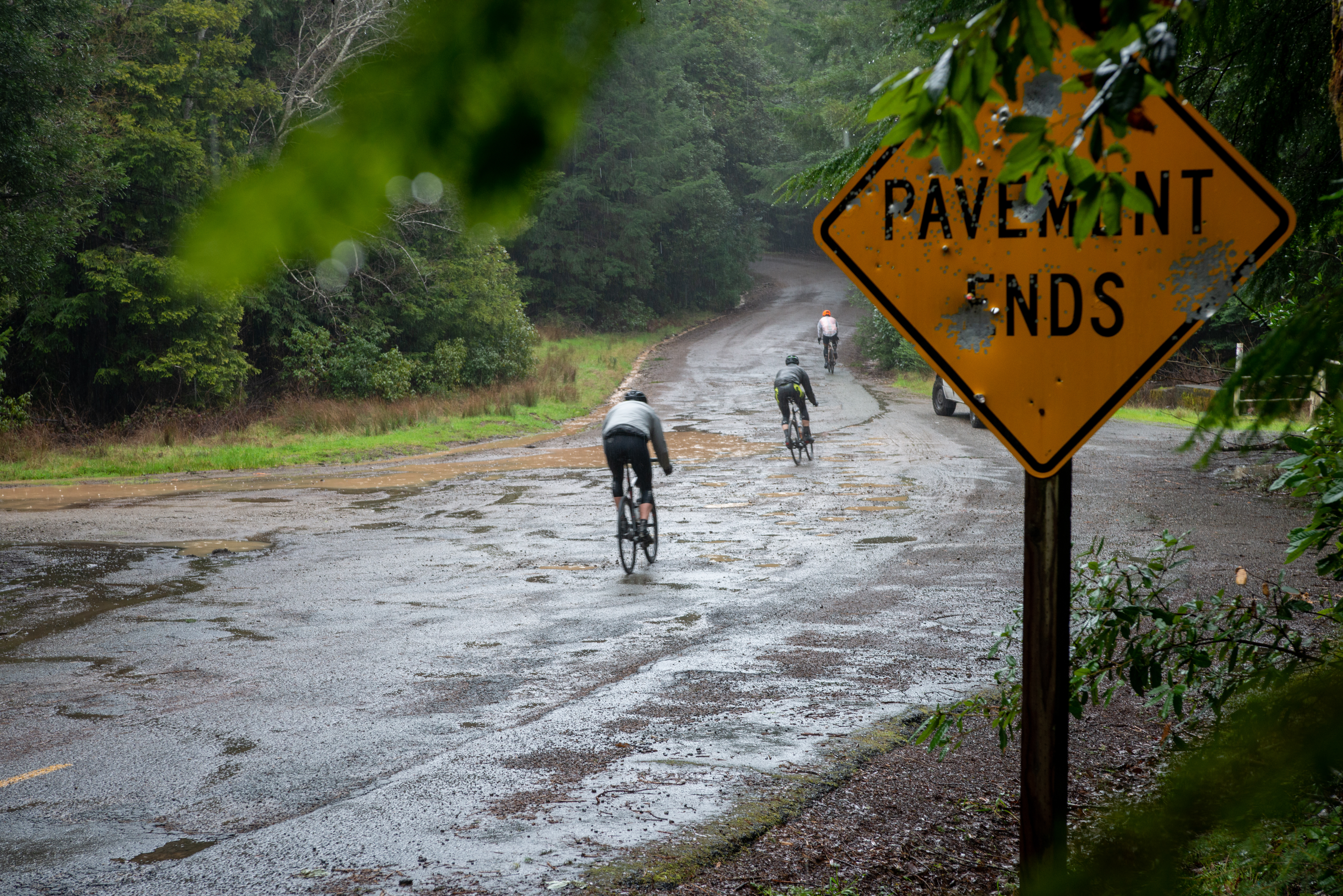 The climb is preambled by a quick descent into what felt like going underground, dark and tree covered broken pavement road with slippery corners and then the “Pavement Ends” sign tells you it’s time to climb.