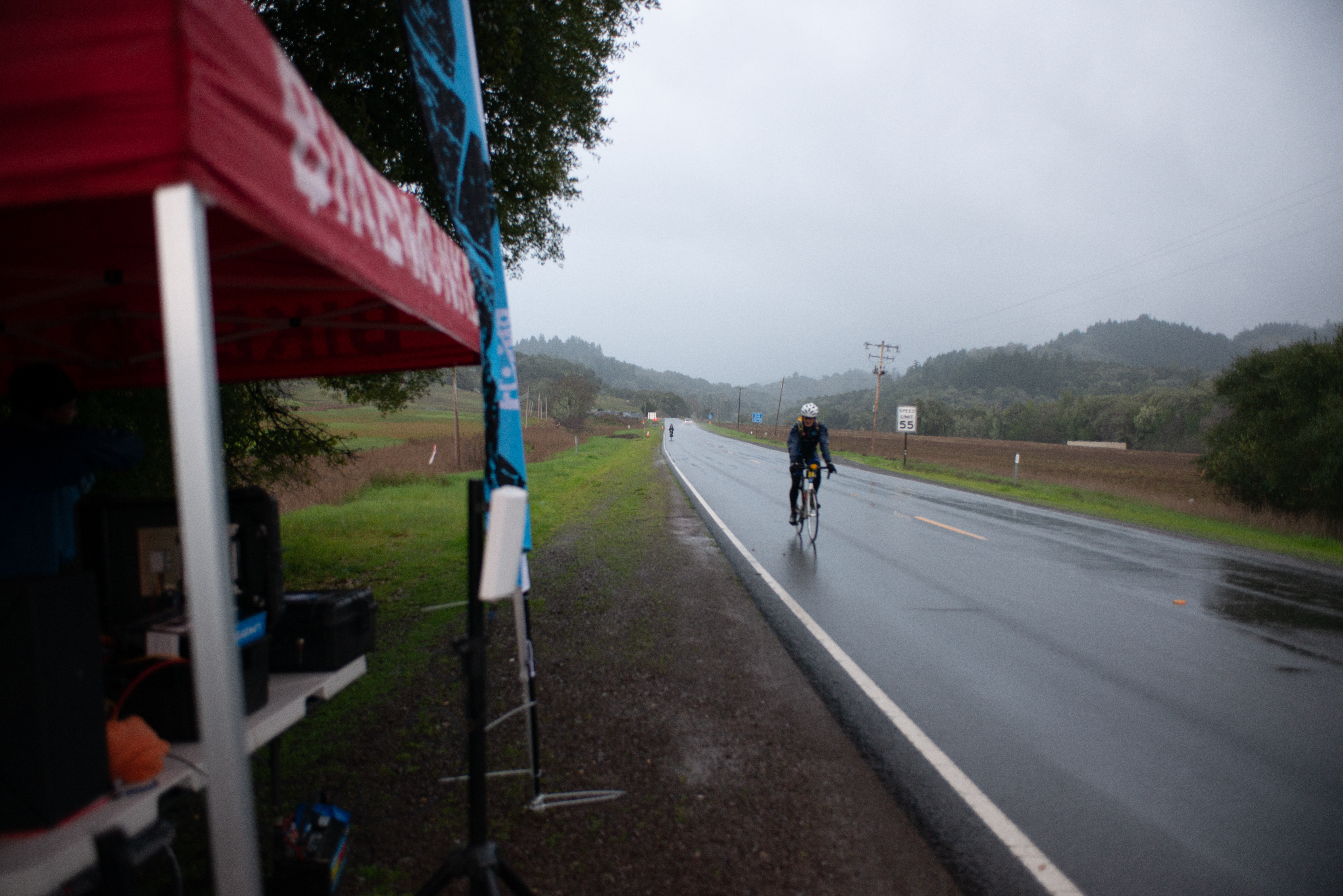 First 3 climbs went smooth and felt pretty good, a bit too warm at times, but by the time I got at the summit rest stop it started pouring rain. Grabbed a quick PBJ, put the second jacket on and prepared mentally for the 7mi descent. Down on CA-1 I was lucky to get in a good group and was able to sit in and rest a bit. Last year I was by myself in the sucking wind – winning!