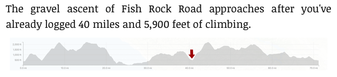 My notes from last year (always write down your race notes…) reminded me that I cramped at the top of Fish Rock climb, so the plan was to avoid that by pacing myself better on the first half of the ride.