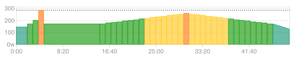 The protocol consist of a 15min warm up at low intensity, followed by a gradual ramp from 60% to 90% FTP and then back down. The resistance is increased by 2% every minute, so it will take 15min to go up and the same 15min to come back down.