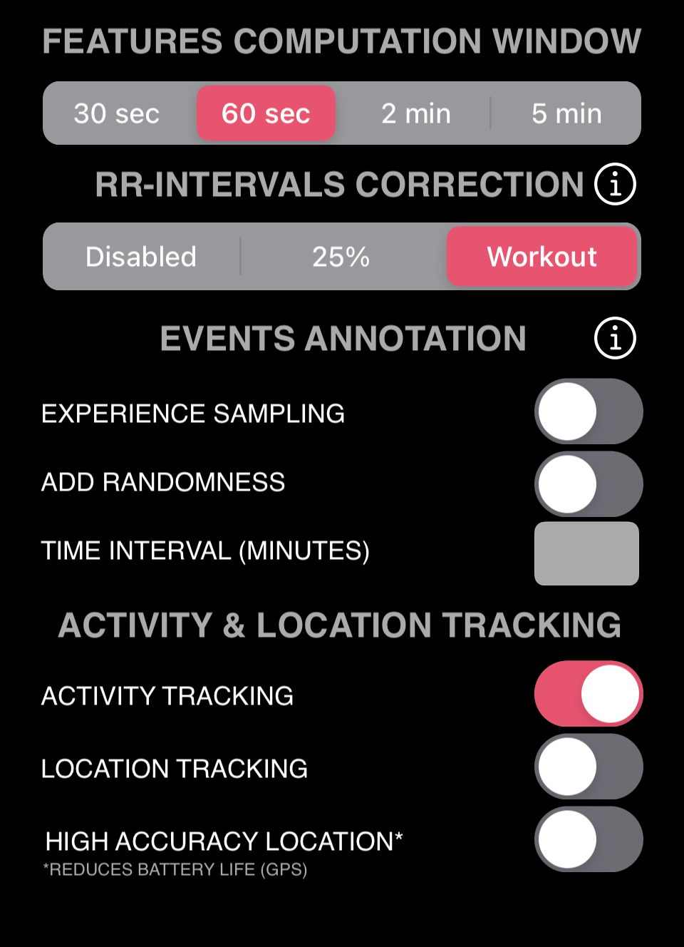 In the HRV logger Settings select 60 sec for the computation window and “Workout” for the RR-intervals correction.