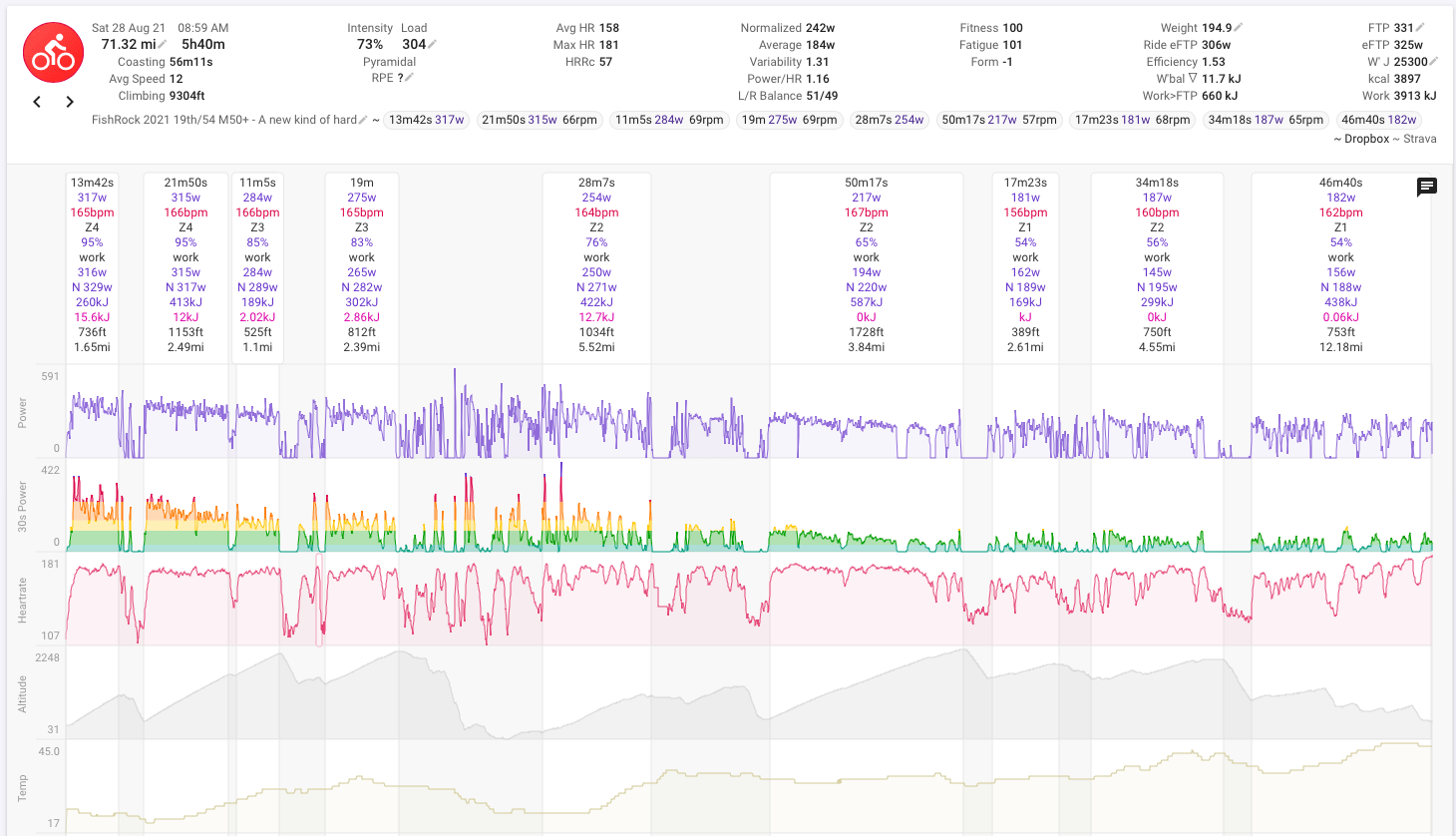 It is pretty telling to compare the power file with the 2019 edition. I ended up with almost 24 more minutes to cross the finish line. I was a bit ahead before the aid station at mile 37. After that the wheels literally fell off the wagon. The main climb I averaged 217W… that’s like 65% FTP, so basically recovery pace.